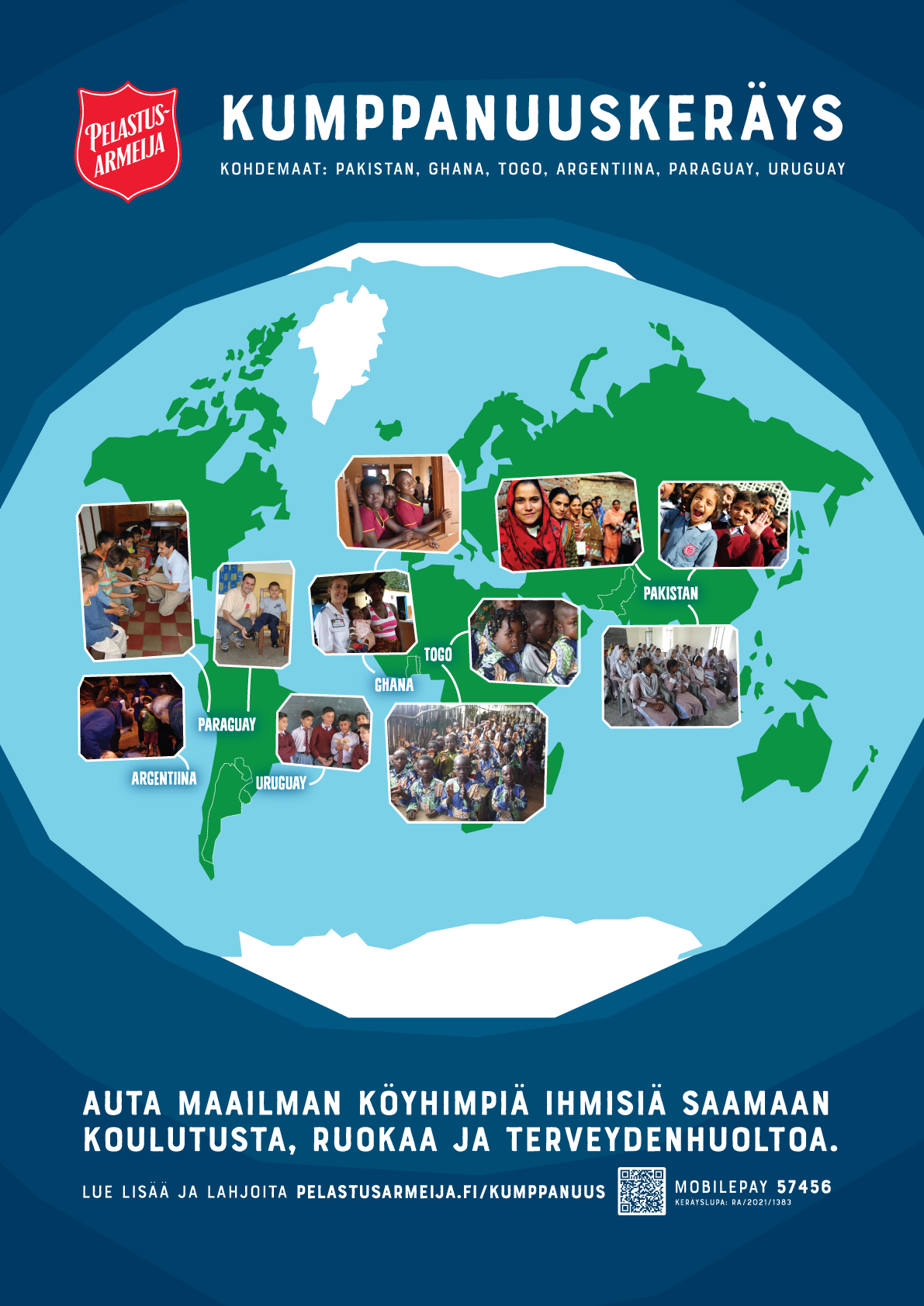 Pelastusarmeijan perinteisen kumppanuuskeräyksen avulla kerätään varoja yhteisöjen, perheiden ja lasten auttamiseksi Pakistanissa, Ghanassa, Togossa, Paraguayssa sekä Argentiinassa ja Uruguayssa. Keräystuotto ohjataan Pelastusarmeijan kansainvälisen päämajan kautta kohdemaihin, joissa paikallinen Pelastusarmeija vastaa avun perille menosta.