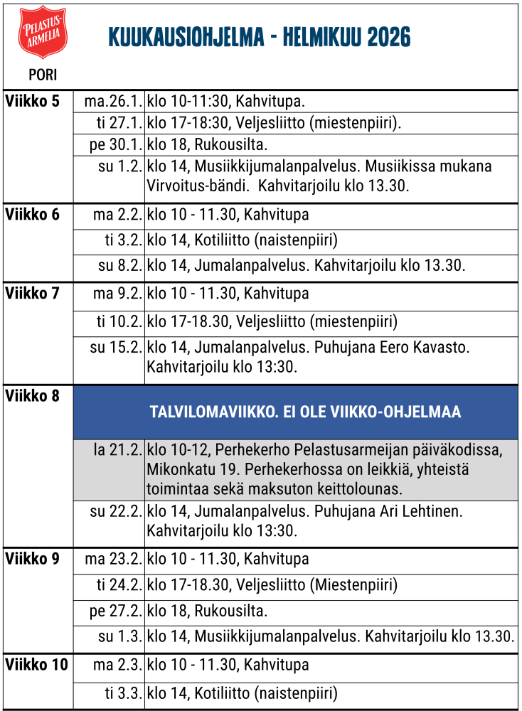 Vähälinnankatu 8, 28100, Pori Puh. 044 757 7870 pori.osasto@pelastusarmeija.fi
