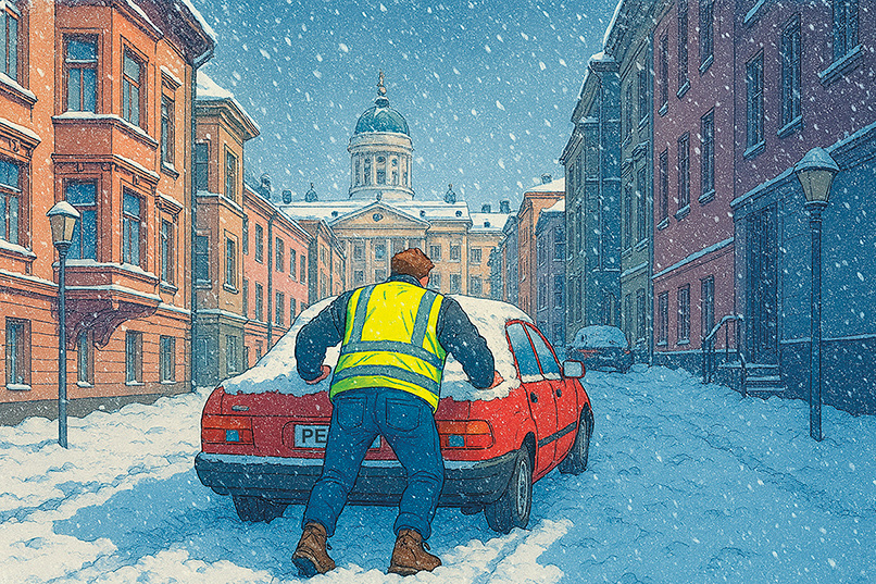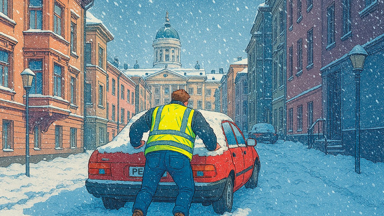 Autohallista ulos ajaminen ja pari metriä siitä eteenpäin onnistui, mutta sitten lumi ja pihan lievä ylämäki kävivät autolleni ylivoimaisiksi ja etenemisyritykset tuntuivat turhilta. Juuri kun meinasin joutua epätoivon valtaan, tunsin, kun joku työnsi autoani voimakkaasti ja auto lähti liikkeelle!
