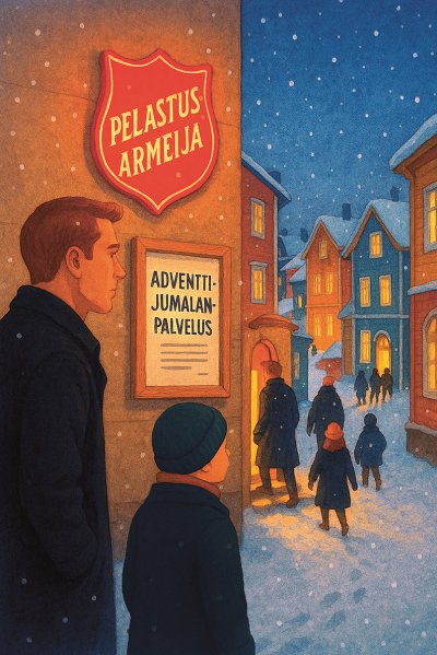 Tuomas pysähtyi ja tuijotti hetken suurta punaista logoa rakennuksen seinässä. Se oli uusi ja valaistu. Muuten kaikki näytti tavattoman tutulta: vähän nuhjuiselta, mutta lämpimältä. Ihmiset kopistelivat lumisia kenkiään ovesta kulkiessaan. Tuomas seisoi niin syrjässä, ettei kukaan huomannut häntä. Hitaasti hän valui lähemmäs. Oven vieressä olevalta ilmoitustaululta selvisi, että alkamassa oli adventtijumalanpalvelus.